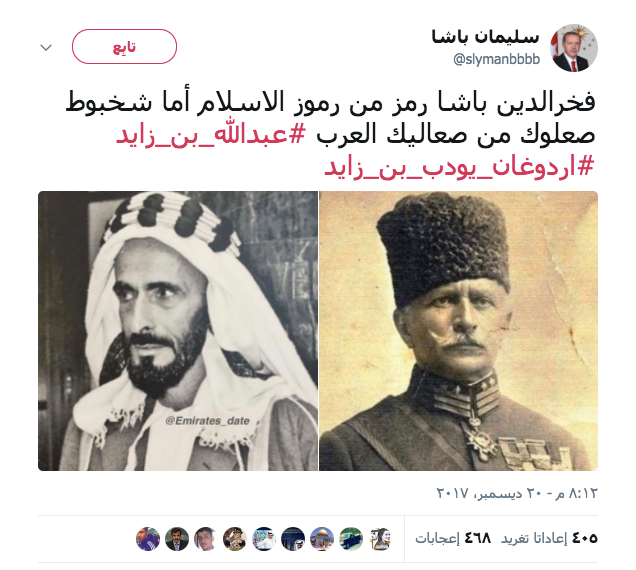 استدعت الخارجية التركية اليوم القائم بالأعمال الإماراتي في العاصمة أنقرة جراء الأزمة التي أثارها وزير خارجية الإمارات عبدالله بن زايد بإعادة تغريدة مسيئة عن العثماني "خير الدين باشا" حيث تتهم التغريدة آخر امراء المدينة المنورة (1919-1916) بسرقة آثار مقدسة وتشريد اهل المدينة فيما رد أردوغان على بن زايد دون ذكر اسمه بتغريدة على حسابه في تويتر قائلا: "عندما كان جدنا فخر الدين باشا يدافع عن مدينة رسول الله عليه الصلاة والسلام أين كان جدك أنت أيها الوقح عديم التربية".