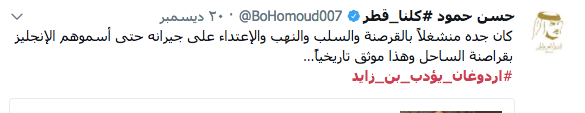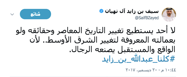 ولم يصمت الجانب الإماراتي حيث غرد سيف بن زايد وزير الداخلية في الإمارات على حسابه في تويتر: "لا أحد يستطيع تغيير التاريخ المعاصر وحقائقه ولو بعمالته المعروفة لتغيير الشرق الأوسط.. لأن الواقع والمستقبل يصنعه الرجال
