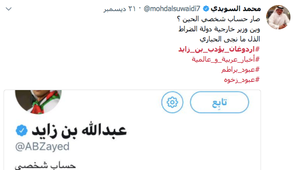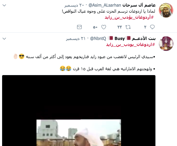وعلى الفور انتشر وسمين على موقع التدوين المصغر "تويتر" #أردوغان_يؤدب_بن_زايد مؤيد لأردوغان والآخر #كلنا_عبدالله_بن_زايد مؤيدا لبن زايد لم تخلو من استجرار المغردين لتاريخ شيوخ أبوظبي المؤيدين للاحنلال البريطاني واخوة لورانس العرب.