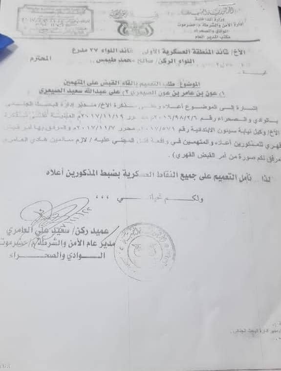 يذكر أن المدعو عون عامر حويلان الصيعري يحمل الجنسية السعودية، وهارب منها (السعودية)، كما أنه متهم بقتل المواطن لازم سالمين العامري، وعليه أمر قبض قهري من النيابة العامة.